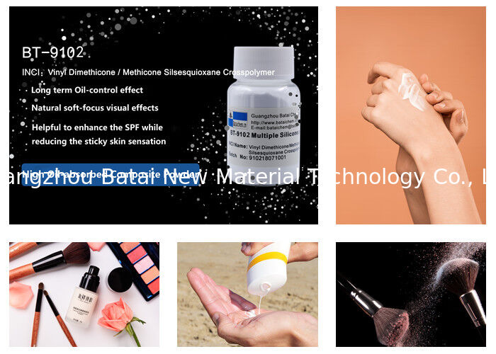 مسحوق السيليكون BT-9102 مصنوع من راتنج السيليكون ملفوفًا بمطاط السيليكون. يوفر إحساسًا غنيًا بالبشرة، وإحساسًا حريريًا ومخمليًا أقوى، وامتصاصًا عاليًا للزيت وتأثيرًا ضبابيًا. خاصة أن تأثيره المطفأ يمكن أن يغطي الخطوط الدقيقة جيدًا، ويمكن لقدرة امتصاص الدهون الأفضل أن تجعل البشرة أكثر انتعاشًا؛ يمكن استخدامه على نطاق واسع في مستحضرات التجميل غير اللامعة (مثل أحمر الشفاه غير اللامع، ملمع الشفاه المخملي غير اللامع، إلخ). إلى جانب ذلك، فهو مناسب لمنتجات المكياج البودرة (مثل البودرة المضغوطة، كريم الأساس، البودرة السائبة، إلخ) ويستخدم أيضًا في منتجات واقية من الشمس والتي يمكن أن تجعل قيمة واقي الشمس مستقرة وتعزز الإحساس بالبشرة.